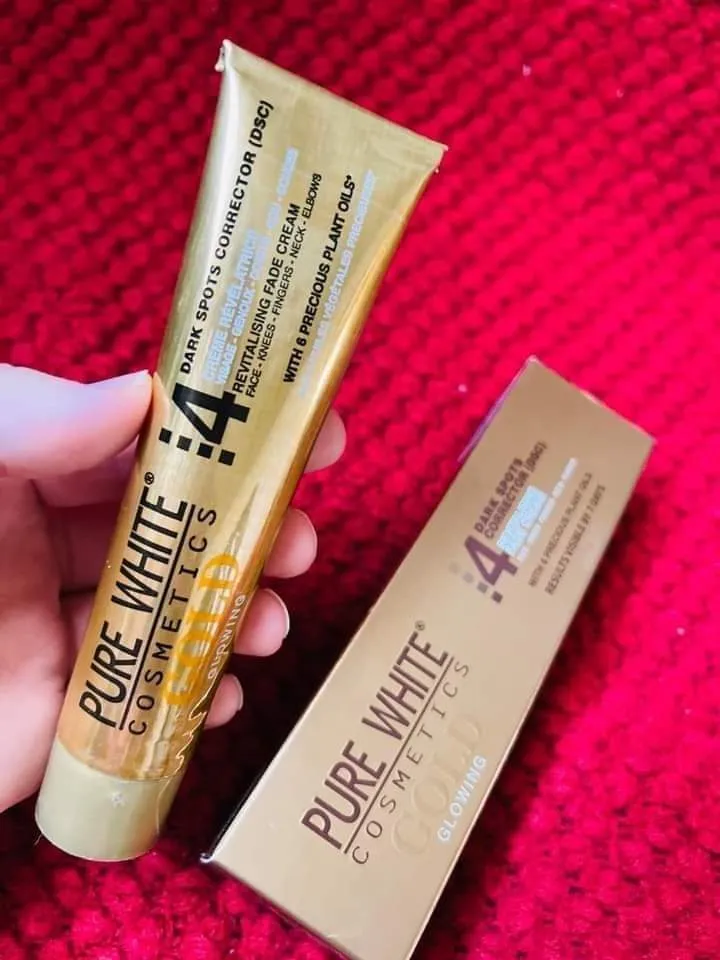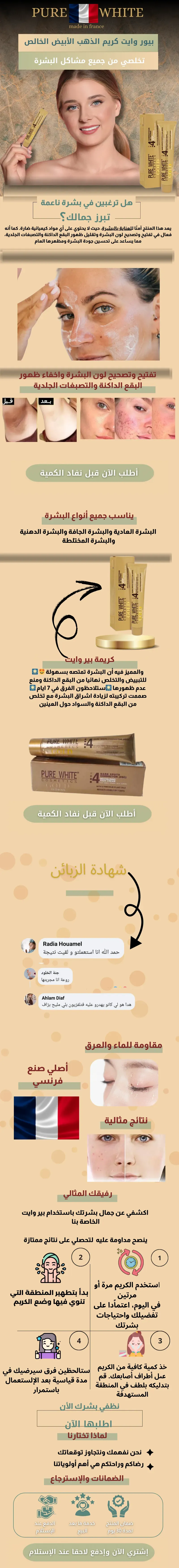 🌸 هل تعانين من البقع الداكنة و اسمرار البشرة؟الكلف ؟ الدسة ؟ تجاعيد ؟ آثار حب الشباب ؟ و حب الشباب مع كريم Pure White Gold تقدرِ ترجعي لبشرتك إشراقتها ونضارتها من أول استعمال! --- ✅ فوائد المنتج: يفتح البشرة ويوحد اللون. يزيل البقع الداكنة والكلف. يحتوي على مكونات طبيعية وآمنة. نتائج واضحة خلال 7 أيام فقط. تحصلي على هدية مجانية مع كل طلب